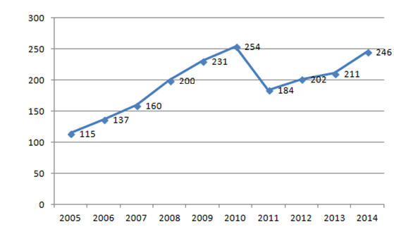 2005-2014年中國含乳飲料和植物蛋白飲料行業公司數量