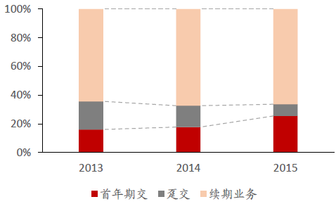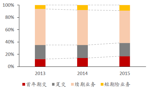 長期期交產品銳增,拉長負債久期增厚價值。首年期交保費大幅增長,在緩解給付風險的同時給保險公司帶來穩定的現金流入,極大的提升了保險公司的內含價值,為險企的持續發展積蓄能量。其中,中國太保2015年首年期交保費增幅達到58%,同年中國平安、新華保險、中國人壽的首年期交保費增幅也分別達到了48%、40%、33%。在規模迅速擴大搶占市場份額和實現企業價值穩定增長兩項選擇上,四大險企選擇了后者,在市占率相對穩定的基礎上轉變增長方式,保持業務穩定。