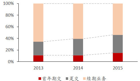 首年期交增加,期限結構改善。從業務結構上看,2015年首年期交保費占總保費占比均大幅提升,中國太保、新華保險、中國人壽、中國平安首年期交占總保費收入分別為26%、31%、17%、27%,較去年分別提高了8個、3個、3個、6個百分點。與此同時,交費期在十年期及以上期交產品保費收入增多。以新華保險為例,2015年個險代理人和服務經營渠道交費期在十年期及以上的保費分別同比增長44%和67%,占兩渠道新單期交保費比例分別達到89%和80%,較去年提高4個和6個百分點。中國人壽2015年首年期交保費增速32.9%,創股改上市以來新高;十年期及以上首年期交保費增速達到25.4%,創七年來新高,占首年期交保費保費52.6%。在打造內含價值的目標下,各大險企必將集中力量繼續加強長期期交產品的研發和銷售。