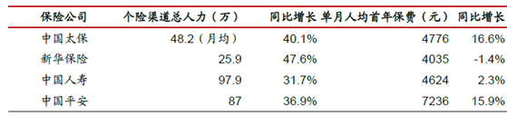 個險向上銀保向下,推高業務價值。個險渠道是高利潤產品的主要銷售渠道,是推動業務價值的核心渠道。各險企正將渠道重心放在個險營銷上,注重個險增員。從2015年的情況來看,四大保險公司個險渠道總人力同比增長均超過30%,其中新華保險個險營銷員增幅達到47.6%。然而從增員到有效業績釋放有一定的時間差,新華個險渠道的大幅增員尚不能立即啟動規模保費的同比例增長,但卻為未未來業績的釋放保存了實力。經過兩年戰略調整的中國太保實現了人力和保費雙高飛,個險渠道總人力增長40.1%,單月人均首年保費同比增長16.6%。