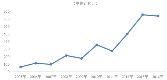 近年來(lái),人們?cè)谖幕瘖蕵?lè)方面的消費(fèi)開(kāi)支逐漸增多,帶動(dòng)了我國(guó)公共文化娛樂(lè)設(shè)施的建設(shè)。2014年我國(guó)完成文化娛樂(lè)固定資產(chǎn)投資4,465.05億元,比2010年的1,811.7億元,增加了 2,653.35 億元,復(fù)合增長(zhǎng)率為 25.30%。