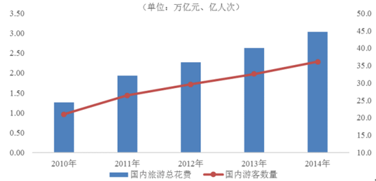 2010-2014年我國(guó)國(guó)內(nèi)旅游總花費(fèi)及游客數(shù)量情況