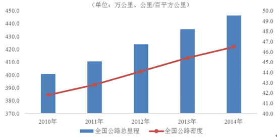2010-2014我國(guó)公路總里程及公路密度情況