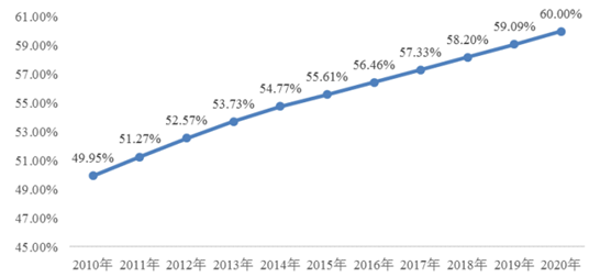 2010-2020年我國(guó)城鎮(zhèn)化率及預(yù)測(cè)