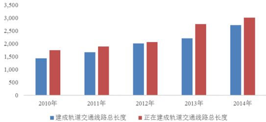 在城市內(nèi)部交通建設(shè)方面,城市軌道交通因其運(yùn)量大、安全環(huán)保以及節(jié)約土地、能源等獨(dú)特優(yōu)勢(shì),已經(jīng)成為各國(guó)城市的重要出行方式。截至2014 年,我國(guó)已有 22 個(gè)城市建成軌道交通,線路總長(zhǎng)度 2,715 公里,比上年增長(zhǎng) 22.7%,建成車站數(shù)目 1,786 個(gè);另有 36 個(gè)城市在建軌道交通,在建線路總長(zhǎng) 3,004 公里,比上年增加 8.8%,在建車站數(shù)目 2,047 個(gè)。