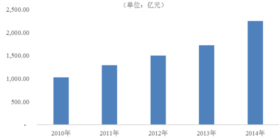 2010-2014年我國(guó)體育、文娛、養(yǎng)老健康社會(huì)保障業(yè)的固定資產(chǎn)投資情況(單位:億元)
