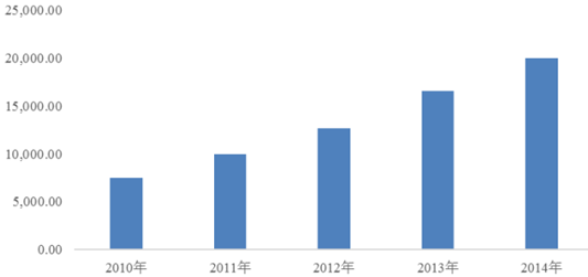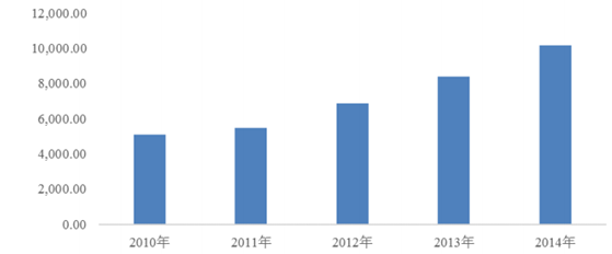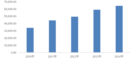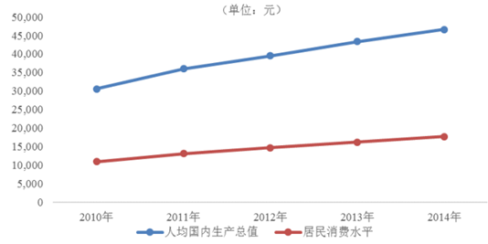 我國(guó)經(jīng)濟(jì)的發(fā)展帶動(dòng)了居民消費(fèi)水平的增長(zhǎng),我國(guó)已進(jìn)入消費(fèi)需求持續(xù)增長(zhǎng)、消費(fèi)結(jié)構(gòu)加快升級(jí)、消費(fèi)拉動(dòng)經(jīng)濟(jì)作用明顯增強(qiáng)的階段。2014 年我國(guó)人均 GDP 達(dá)到了46,629.0 元,較 2010 年增長(zhǎng)了 52.55%,相應(yīng)的居民消費(fèi)水平則從 2010 年的 10,919 元增長(zhǎng)至 2014 年的 17,705 元,期間增幅達(dá) 62.15%。