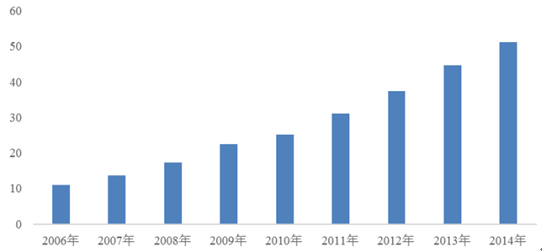 我國(guó)全社會(huì)固定資產(chǎn)投資規(guī)模由 2006 年 11.0 萬(wàn)億元增加到 2014 年 51.2 萬(wàn)億元,年均復(fù)合增長(zhǎng)率達(dá)21.22%。