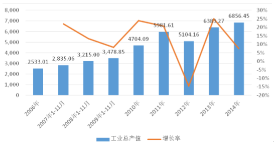 2006-2014 年中國針織行業(yè)工業(yè)總產值規(guī)模及增長