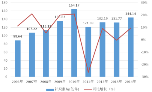 核心提示:一、針織行業(yè)發(fā)展現狀針織工業(yè)是我國紡織工業(yè)中產業(yè)鏈相對較為完整的行業(yè),隨著國內外市場的不斷擴大,我國針織行業(yè)近幾年都保持了較 快的發(fā)展。2006年針織服裝產量為88.64億件,到2014年增長至144.14億件, 累計增長 62.61%一、針織行業(yè)發(fā)展現狀
