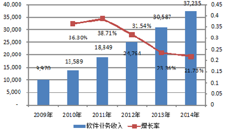 近年來,隨著國家產業政策的大力扶持以及各行業信息化要求逐步提高,對軟件需求持續不斷增長,軟件行業處于快速增長階段。根據工信部網站公布的數據,我國軟件行業2009年實現業務收入僅為9,970億元,2014年實現業務收入37,235億元,與2009年相比,增幅達273.47%,年均復合增長率為30.15%。受益于國家政策對軟件及信息技術服務業的大力支持和互聯網浪潮的興起,預計我國軟件信息和技術服務業產業規模仍將保持快速增長。