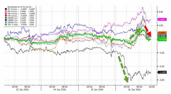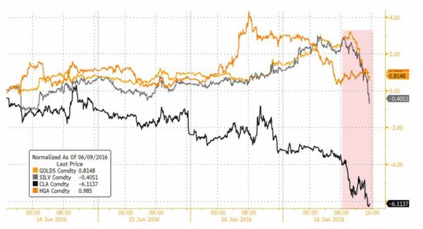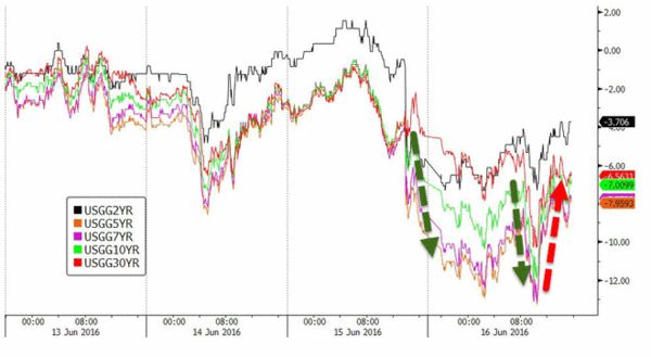 美聯儲在6月FOMC會議上維持利率不變,符合市場預期,并未就7月會議上是否加息給出明確暗示。FOMC官員中值預期顯示今年內加息兩次,但有六名成員預期年內僅一次加息,較3月時的一人大幅增加。會議之后,美股由漲轉跌,未能逆轉此前連跌四日的頹勢。美聯儲主席耶倫在會后的新聞發布會上表示,英國退歐形勢是美聯儲決策時考慮的一個因素,該事件可能會影響美國經濟前景展望。