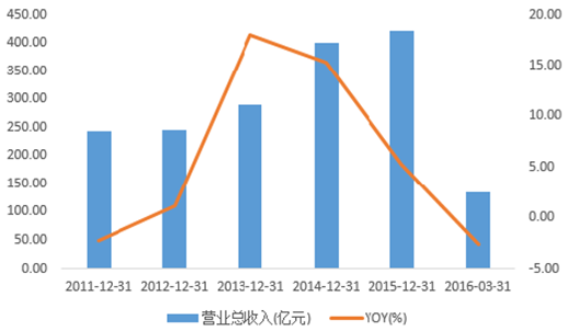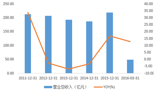 2011-2016年中國紡織服裝板塊主營收入YOY