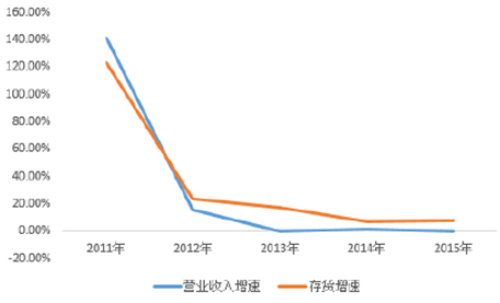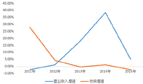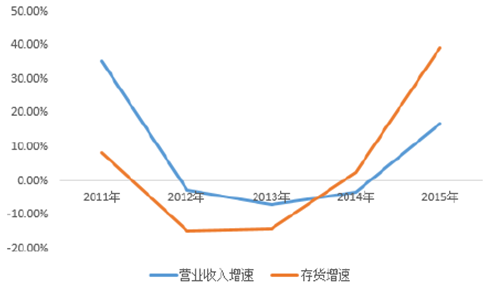 2011-2015年中國紡織服裝營收增速與存貨增速匹配