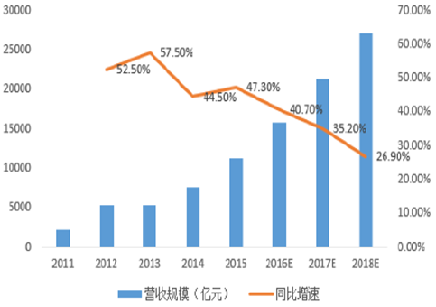 2014-2016年中國電商類主營收入及增速