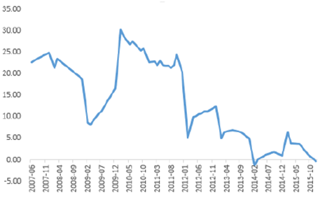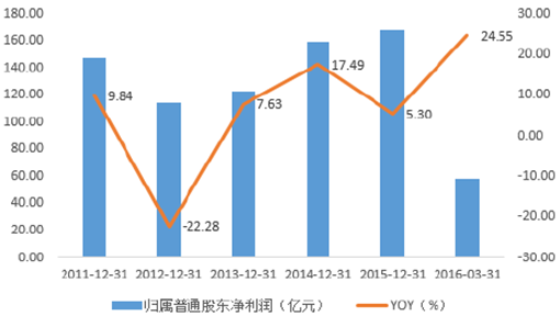 2011-2016年中國紡織服裝板塊歸屬于母公司的凈利潤YOY