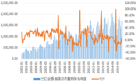 2002-2015年中國服裝及輔料出口金額及同比增速