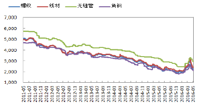 進入2016年,“黑暗勢力”暴動,鋼價呈現底部反彈,各品種價格瘋狂上漲。16年4月下旬,螺紋鋼最高漲至2950元,較2015年12月最低價上漲了75%;同期,鐵礦石價格指數從41美元/噸上漲到75.2美元/噸,上漲幅度為83.4%。在經過3、4月份的猛烈上漲走勢之后,5月份國內鋼價迎來暴跌,一舉跌回至3月初的價格水平。