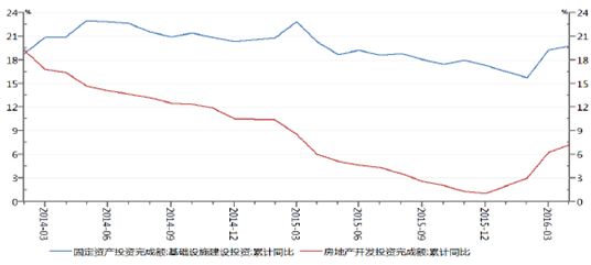 2016年第一季度,基礎設施建設投資增速和房地產開發投資增速較去年都有較大提高。 3月基礎設施建設投資增速環比增長了3.54個百分點,房地產開發投資增速也環比增長了3.2個百分點,但4月兩個指標增速均有所放緩,分別只環比增加了0.48個百分點和1個百分點。雖然第一季度中國經濟企穩,房地產開發投資和基礎設施建設投資同比都有所增長,但中國經濟面臨的固有矛盾還沒有根本解決,在中國經濟維持6.5%-7%的低增速情況下,即使鋼鐵行業靠投資拉動有了階段性的回暖,但是部分地區財政收支平衡壓力依然較大,加上房地產泡沫的風險的存在,鋼鐵行業的后期需求難以有較大的提升空間。