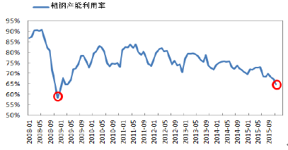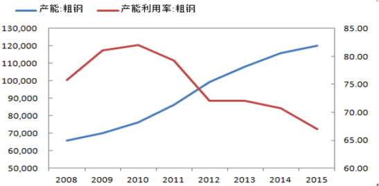 根據國家統計局數據統計,到2015年底中國粗鋼產能到達12億噸,中國粗鋼產量8.04億噸,與鋼鐵產量產能大增伴隨的是產能利用率不斷下降,15年底產能利用率只有64.8%,達到近五年來的歷史最低點,鋼鐵行業全行業虧損。