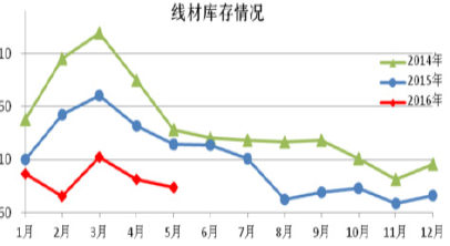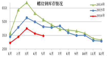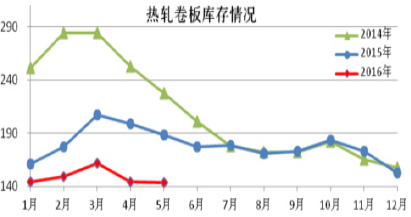 根據中國鋼鐵工業協會統計,2016年5月,全國20個城市5大類品種鋼材社會庫存合計環比繼續下降,尤其長材產品庫存全部下降,板材產品庫存略有上升。5月鋼材的社會庫存為811.6萬噸,環比減少20.28萬噸,下降2.44%。其中鋼材市場庫存總量712.5萬噸,比上月減少33.12萬噸,下降4.44%。同時,鋼廠鋼材庫存也在一季度有所下降,3月鋼廠鋼材庫存1319.20萬噸,環比二月下降10%,而一季度庫存總量也相對去年同比下降了17.05%。