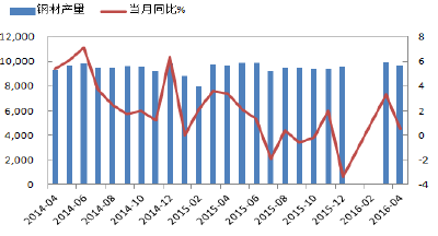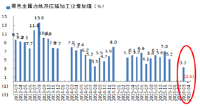 1、國民經濟增速持續回落,國內鋼鐵行業工業增加值出現負增長。從國家統計局公布的月度數據來看,目前鋼鐵行業工業增加值增長率持續下跌,尤其在2016年4月,從去年同期6.1%降到-0.3%,首次出現月度負增長的情況,這從宏觀層面說明鋼鐵行業企業整體業績增長情況較差,基本面并沒有真正好轉。