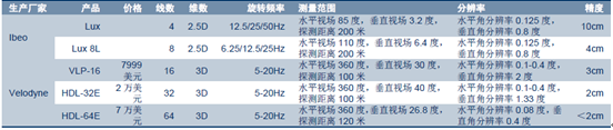 目前,有旋轉部件的激光雷達技術較為成熟,國外主流生產廠家為Velodyne和Ibeo。Velodyne采用激光發射、接收一起旋轉的方式,產品涵蓋16/32/64線;Ibeo采用固定激光光源,通過內部玻璃片旋轉的方式改變激光光束方向,實現多角度檢測,產品涵蓋4/8線,歐百拓為Ibeo的國內代理商。