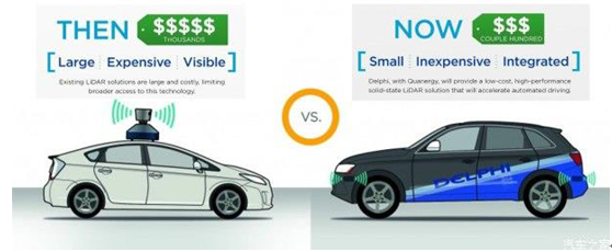 激光雷達固態化是未來趨勢,存在小型化、低成本優勢。固態激光雷達無需旋轉部件,因而體積更小,方便集成在車身內部,并且系統可靠性提升,成本也可大幅降低。因此激光雷達有向固態發展的趨勢。創業公司Quanergy與德爾福合作開發出了固態激光雷達,計劃2017年底量產,采取相控陣技術,內部不存在任何旋轉部件。傳統優勢企業Velodyne和Ibeo也推出了混合固態激光雷達,在外觀上看不到旋轉部件,但內部仍靠機械旋轉實現激光掃描。