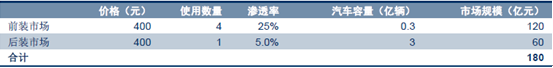 激光雷達2020年市場規模有望超100億。預計激光雷達受益于技術提升及產能提升,2020年單只激光雷達成本有望達到400元,以整車安裝2-4個激光雷達(前后探測距離)測算,對應整車成本為800-1600元。按照2020年前裝市場25%滲透率、后裝市場5%滲透率估算,中國市場規模有望近200億。