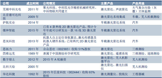 國內有數家公司參與激光雷達的研發與生產,應用領域包括大氣污染檢測、三維測繪、汽車等。