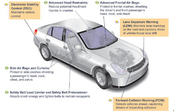 美國高速公路安全管理局NHTSA在汽車五星安全標準中明確加入ADAS。NHTSA指出,高達94%的汽車事故與人為失誤有關,因此強烈建議安裝ADAS主動安全系統,包括前撞預警FCW,車道偏離預警LDW,以及后視系統RVS;并建議安裝行人檢測系統PDS,自動緊急制動AEB,盲區檢測BSD等。
