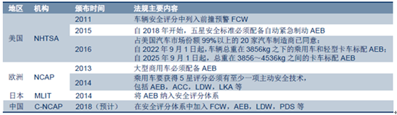 核心提示:一、汽車安全法規助力ADAS快速發展歐美日均將ADAS列入汽車安全法規,中國或于近年效仿。美國高速公路安全管理局NHTSA自2011年起就將汽車前撞預警FCW納入車輛安全評分,并規定自2018年開始五星安全標準車輛必須配備自動緊急制動A一、汽車安全法規助力ADAS快速發展
