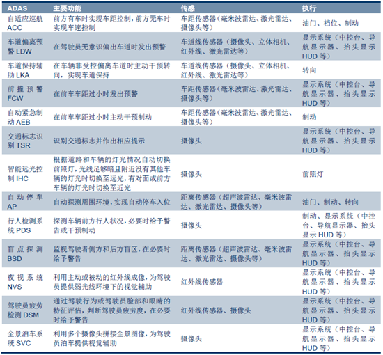 ADAS作為車輛智能化的初級階段產品,有望率先普及商業化。根據技術條件和產業化發展階段,目前處于輔助駕駛向半自動駕駛推進的階段,ADAS作為過渡產品預計將率先普及。主要的ADAS技術包括自適應巡航ACC,車道偏離預警LDW,車道保持輔助LKA,前裝預警FCW,自動緊急制動AEB,盲點探測BSD,自動泊車AP等。