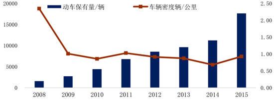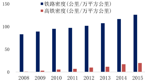 2015 年全國動車組保有量 1883組、17648 輛,比上年增加 479 組、3952 輛。動車保有量增速雖然較快,但線路的車輛密度較非常低,2015 年每公里高鐵僅匹配 0.93 輛動車(8 輛為 1 列) ,加密需求具有剛性。