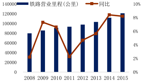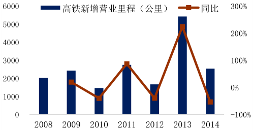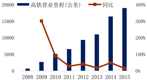 核心提示:根據鐵路局 2015 年鐵道部統計公報,2015年全國鐵路固定資產投資完成 8238 億元,投產新線 9531 公里,其中高速鐵路 3306公里。全國鐵路營業里程達到 12.1 萬公里,比上年增長 8.2%,其中高鐵營業里程超過1.9 萬公根據鐵路局 2015 年鐵道部統計公報,2015年全國鐵路固定資產投資完成 8238 億元,投產新線 9531 公里,其中高速鐵路 3306公里。全國鐵路營業里程達到 12.1 萬公里,比上年增長 8.2%,其中高鐵營業里程超過1.9 萬公里,比上年增長 15.46%,超額完成原定十二五規劃。 高鐵投資目前已經到了高位,2014 年高鐵新增營業里程(竣工)為 5428 公里,比 2013 年新增營業里程激增224.6% ;2015 年高鐵竣工里程僅為 2544 公里,同比下降 53% 。可見,高鐵投資將 逐漸放緩。