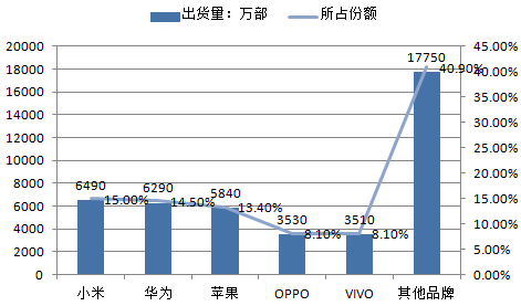 2015年中國大陸智能手機市場整體出貨量達4.341億部,同比增長2.5%。與全球領(lǐng)域三星銷量領(lǐng)先不同,國內(nèi)市場國產(chǎn)品牌銷量占據(jù)了榜首地位,小米出貨量達到6490萬部,同比增長了23.2%,所占份額達到了15%。華為智能手機出貨量達到6290萬部,同比增長超過5成,排名升至第二,市場份額達到了14.5%,超越了蘋果的13.4%。第四和第五分別是OPPO和VIVO,憑借線下渠道的優(yōu)勢,國內(nèi)銷量達到了3530和3510萬部。具體如下圖所示: