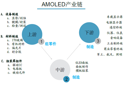 2、AMOLED產業鏈分為上游的設備廠商、材料廠商和零組件廠商,中游是面板廠商,下游應用包括智能手機、可穿戴設備、VR/AR、電視、PC、平板等各類終端。產業崛起上游最先開始受益,但上游技術門檻較高,大陸在上游這一環節最弱。大陸投資主要集中在中游面板環節,與較為封閉的上游不相匹配。參考韓國的經驗,中游面板先行,面板國產化的需求將刺激上游的發展。