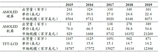 如果說AMOLED于智能手機市場是一種替代性的應用機會,那么于可穿戴設備和VR則是成長性的應用機會。由于可穿戴設備和VR還處于行業的發展初期,近幾年的市場彈性沒有智能手機高,2015-2019年市場規模合計在45億美元左右;但VR和可穿戴設備有望成為繼智能手機之后的計算平臺,我們看好AMOLED在新產業趨勢下的長期成長機會。