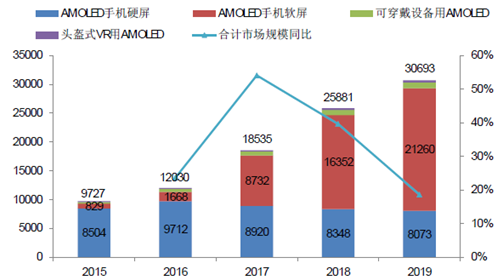 2015-2019年AMOLED總體市場規模(百萬美元)