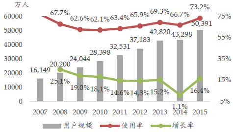 我國網(wǎng)絡(luò)視頻用戶規(guī)模、增長率和使用率