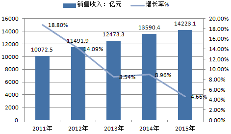 2011年~2015年全國卷煙銷售收入及增長率走勢