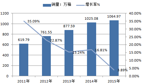 2011年~2015年全國卷煙銷量及增長率走勢