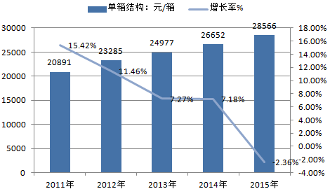 從近五年的走勢看,單箱結構增長勢頭有所下降,從2013年起降幅有所趨緩,至2015年略有回升,比2014年高出0.48個百分點。