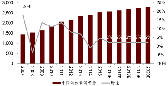 我國(guó)液態(tài)奶需求及增速預(yù)測(cè)