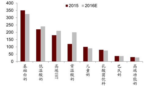 在半年至一年左右的較短期限內(nèi),因幾大下游乳品龍頭均未提出全新品類(lèi)的拓展計(jì)劃,行業(yè)需求的增量基本由現(xiàn)有的幾大仍有增長(zhǎng)的細(xì)分品類(lèi)(常溫酸奶、低溫酸奶、高端 UHT)推動(dòng)。短期內(nèi)我們?nèi)匀豢春眠@三大品類(lèi)增長(zhǎng)的持續(xù)性,但從增速的角度,這三大品類(lèi) 2016 年出廠口徑銷(xiāo)售規(guī)模將接近/超過(guò) 200 億元,經(jīng)過(guò)幾年的爆發(fā)期后,品類(lèi)集中度均較高 (幾大龍頭企業(yè)基本全部進(jìn)入這些品類(lèi)) , 因品類(lèi)基數(shù)逐年變大, 增速很難越來(lái)越快。
