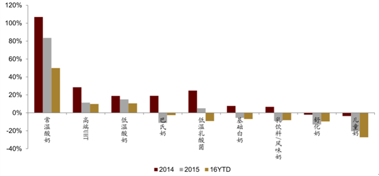 2014-16YTD 不同液體乳品類(lèi)終端銷(xiāo)售增速比較