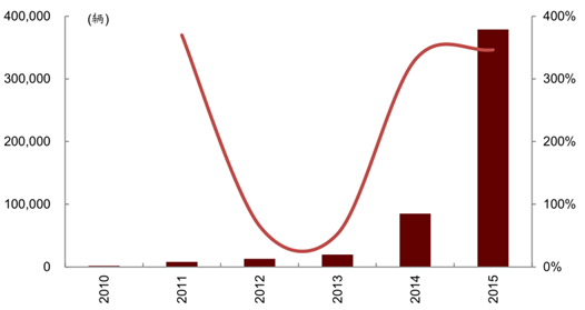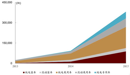 2013 年國內(nèi)純電動(dòng)客車產(chǎn)量僅 1,700 輛,而 2015 年這一數(shù)據(jù)就被刷新到了 8.8 萬輛,年均增速超 600%。2015 年,我國生產(chǎn)了純電動(dòng)專車 8.8萬輛,插電混動(dòng)客車 2.4 萬輛。2016 年 1 季度,純電動(dòng)客車和純電動(dòng)專車的產(chǎn)量增速依然分別保持 84.4%/34.0%的快速發(fā)展。