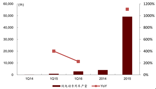 2016 年1 季度純電動(dòng)專用車產(chǎn)量增速 225%