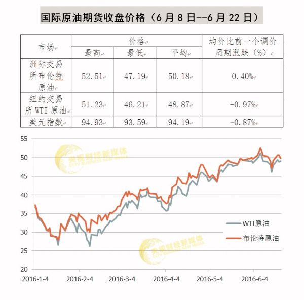 本輪調(diào)價(jià)周期內(nèi),英國(guó)脫歐公投和美聯(lián)儲(chǔ)貨幣政策會(huì)議導(dǎo)致市場(chǎng)波動(dòng),影響了油價(jià)走勢(shì)。6月9日始,市場(chǎng)對(duì)英國(guó)脫歐的擔(dān)憂情緒開始蔓延,投資者轉(zhuǎn)向避險(xiǎn)貨幣,油價(jià)下跌;13日,美聯(lián)儲(chǔ)下調(diào)經(jīng)濟(jì)增長(zhǎng)預(yù)估且仍暗示今年將加息兩次重壓了油價(jià);16日,油價(jià)在連跌六日后達(dá)本月最低點(diǎn),在此期間,美元指數(shù)多次上漲,使油價(jià)下降加速。17日始,美元走軟,市場(chǎng)對(duì)英國(guó)脫歐憂慮減弱,油價(jià)止跌轉(zhuǎn)升。6月22日,WTI、布倫特原油期貨價(jià)格分別為每桶49.13美元、49.88美元,比6月8日分別下降4.10%、5.01%。