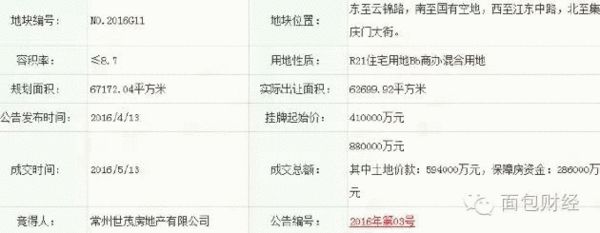 2016年5月13日,世茂旗下子公司經過88輪廝殺,最后以88億元的價格拍得南京約6.7萬平方米的地塊,溢價率高達114.63%,成為南京年內總價地王。樓板價超過同地區現有房價。下圖是面包財經(微信公眾號:mbcaijing)翻查的當時官方的土地成交公告: